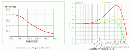 信號的高頻成分經(jīng)過PCB 走線或者電纜傳輸后相對于信號的低頻成分會被衰減得更多,此現(xiàn)象被稱為趨膚效應(yīng),它會破壞高速信號的信號完整性,使其眼圖關(guān)閉并增加信號抖動。為了補償趨膚效應(yīng),人們發(fā)明了均衡器、預(yù)加重器、去加重器來補償傳輸線頻率響應(yīng)的不平坦性。圖2 是一種傳輸線和均衡器的頻率響應(yīng)圖,傳輸線模型在高頻處會衰減得更多而均衡器在高頻處有更高增益,將均衡器的高頻增益設(shè)置成適當(dāng)?shù)闹?,傳輸線和均衡器串聯(lián)后會形成在全頻帶內(nèi)大致平坦的頻率響應(yīng)。