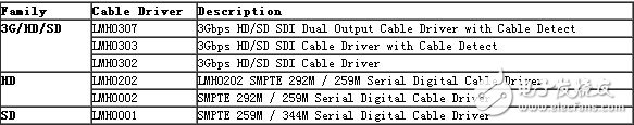 SDI 線纜驅(qū)動器用來加強對線纜的驅(qū)動能力,提供標(biāo)準(zhǔn)的800mV 峰峰值輸出電壓擺幅,沒有預(yù)加重和去加重功能。TI 的線纜驅(qū)動器系列如表4 所示。