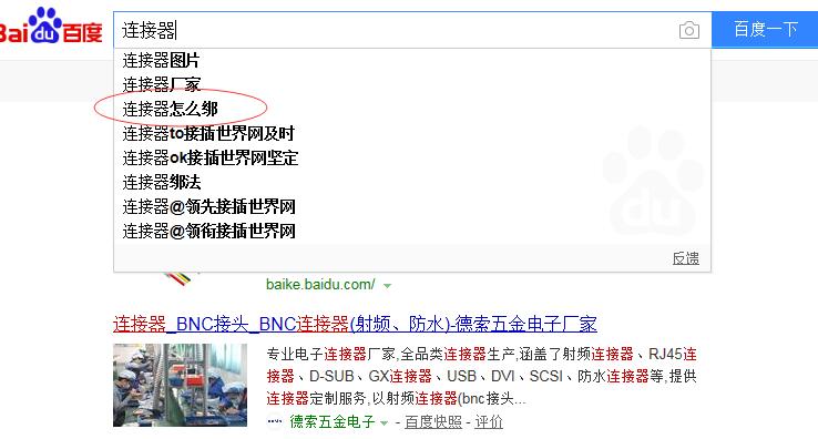 在百度下拉框,筆者發(fā)現(xiàn)不少用戶在搜索“連接器怎么綁”這個(gè)問題,于是筆者也搜索了一下這個(gè)問題,出來的都是魚鉤連接器的信息,讓筆者很是不解。在這里,筆者實(shí)在難以揣測(cè)用戶背后的真實(shí)意圖。