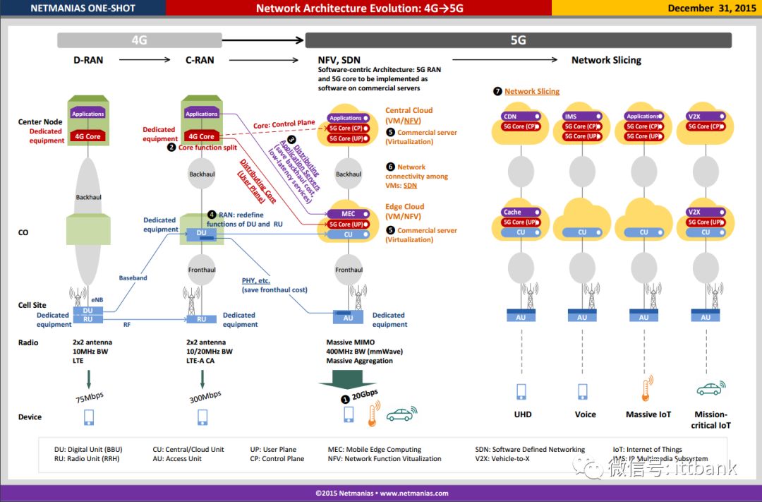 無線接入側(cè)的變化就相對很大了。上圖有兩個基本概念,BBU(上圖中的DU)和RRU(上圖中的RU,有時也叫RRH)。BBU就是基帶單元(baseband unit),一般生成與處理數(shù)字基頻RF信號;RRU則為射頻拉遠(yuǎn)單元(remote radio unit)。3G時代BBU和RRU實(shí)現(xiàn)了設(shè)備分離;不過如上圖所示,3G、4G時期盛行的D-RAN(分布式無線接入網(wǎng)),BBU和RRU還是放在同一個機(jī)柜中的。