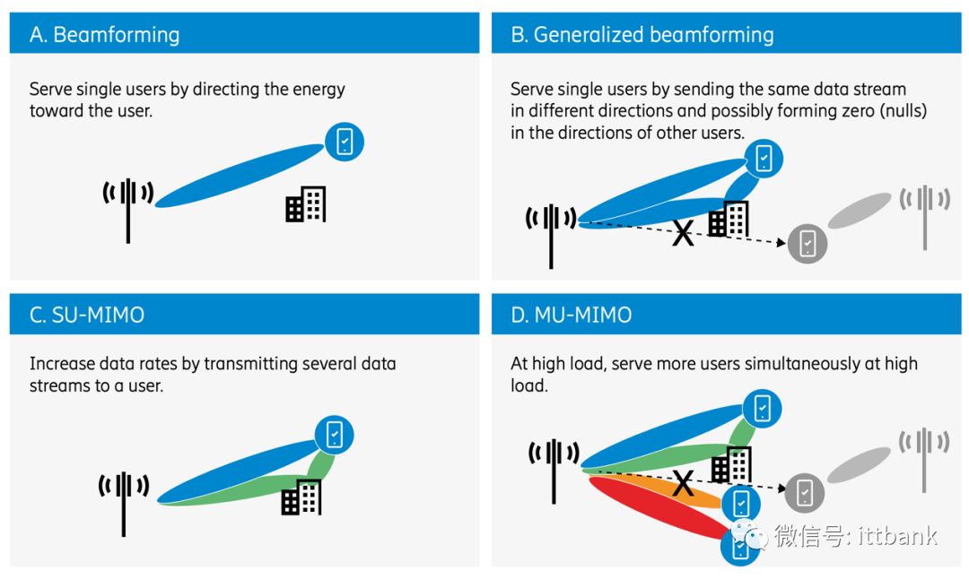 AAS系統(tǒng)的主要作用有兩個,其一是有源天線可將信號專注到一個特定的方向,這樣一來從基站抵達(dá)特定設(shè)備的信號也就更強(qiáng),這就是Beamforming波束成形技術(shù)。第二,這里的天線陣列就是MIMO天線,通過多個無線信道同時服務(wù)多用戶,實(shí)現(xiàn)MU-MIMO。