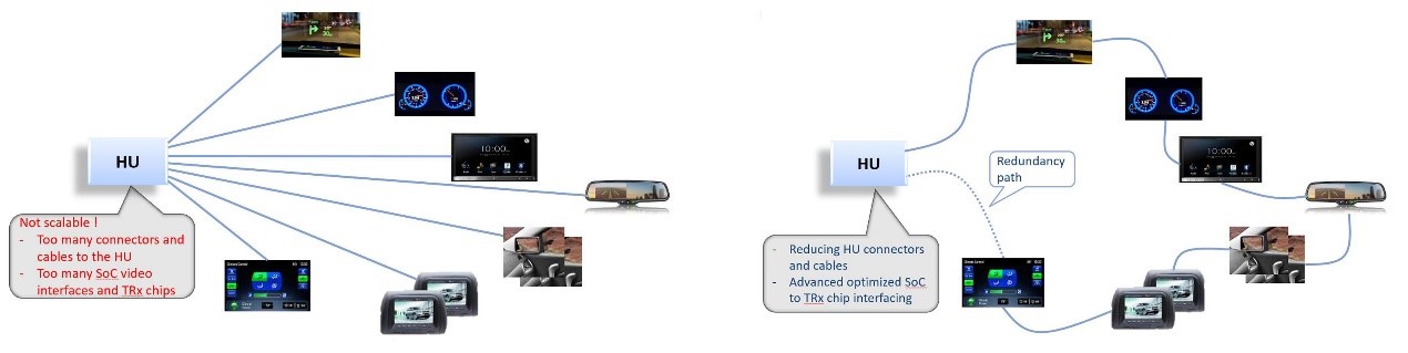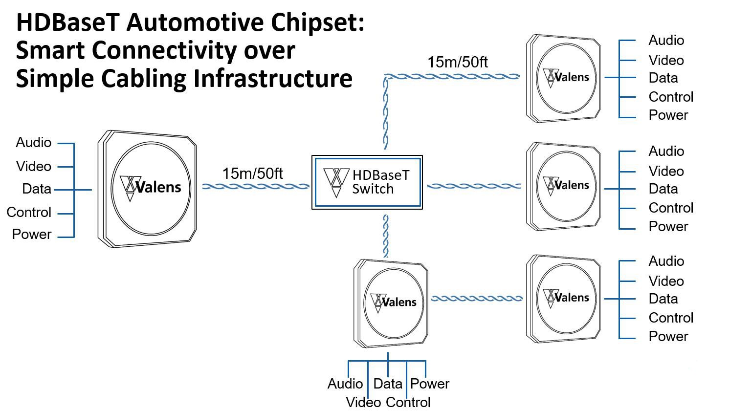 在邁向自動駕駛的過程中,除了車載傳感器的融合以外,我們也從Valens汽車電子事業(yè)部高級業(yè)務(wù)拓展經(jīng)理鄧濤那里,了解了有線連接的融合方案?!败?yán)锩嬗泻芏鄸|西要傳:音頻、視頻、以太網(wǎng)、控制、串口、電源等等。我們把所有這些信號,聚合到一根線上傳?!边@實際就是Valens的HDBaseT車載芯片,通過一根線來實現(xiàn)智能連接。在高速、低延遲之外,“最小是2Gbps帶寬,4G/8G都有,明年我們會出16Gbps的”,實現(xiàn)一根線纜傳輸這么多信號“并不簡單,我們是多點到多點的通信,需要尋址、需要協(xié)議棧,我們將這套方案做好。視頻信號有視頻包頭,音頻信號有音頻包頭,可在10ms以內(nèi)將數(shù)據(jù)直接恢復(fù)出來?!?/p>