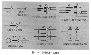 德索工防師指出,常用接插件在電路圖中的表示符號如圖31-4所示。注意:多個電極的插頭、插座分別通過虛線連接起來,表示一個完整的接插件。