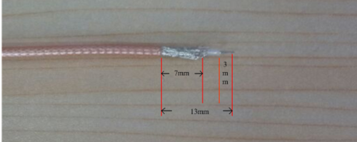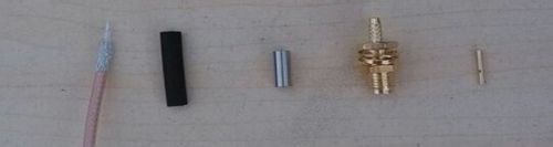 準(zhǔn)備線(xiàn)材。從左至右線(xiàn)材:國(guó)產(chǎn)同軸電纜RG316,熱縮管,壓線(xiàn)套,SMA外螺內(nèi)孔母頭,小針。