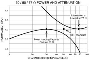 高頻連接器阻抗通常為50或75Ω。最大功率傳輸阻抗值為30Ω,理論最小衰減阻抗為77.5Ω。高頻連接器代表這兩個值之間的妥協(xié),因為它們的平均值約為50Ω。(圖2)當(dāng)需要長時間的傳輸運行時,如CATV系統(tǒng)中的最小衰減,對優(yōu)化功率傳輸?shù)年P(guān)注較少,因此較高阻抗的75Ω連接器通常用于這些系統(tǒng)。
