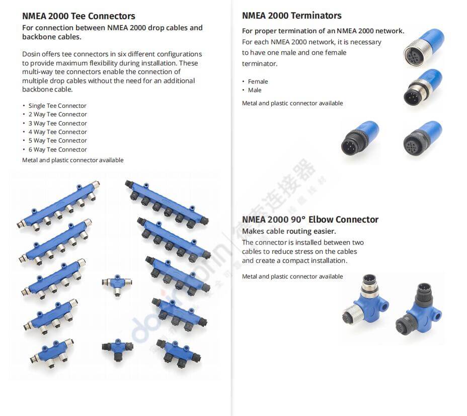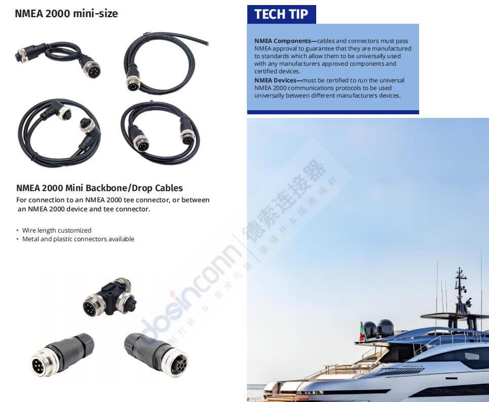 德索精密工業(yè) NMEA 2000 連接器系統(tǒng)是專為滿足 NMEA 2000 協(xié)訂和標(biāo)準(zhǔn)而設(shè)計的。IP68 等級的多端接頭、標(biāo)準(zhǔn)和公制圓形的連接器、傳感器和執(zhí)行器電纜以及彎頭系列是連接船舶電子設(shè)備和顯示設(shè)備的理想選擇。NMEA 2000 系列具有高信號可靠性, 允許多個電子設(shè)備通過一個公共信道共享數(shù)據(jù)。