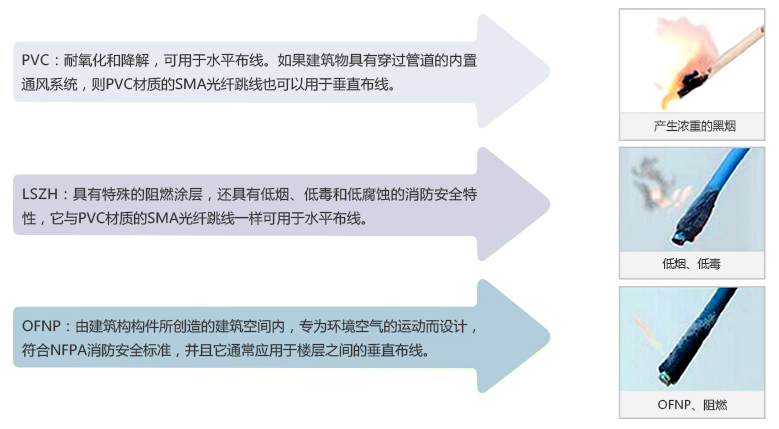 SMA光纖跳線有三種線纜材質(zhì),即PVC、LSZH和OFNP,它們的阻燃性能和特點(diǎn)各不相同,例如OFNP材質(zhì)的SMA光纖跳線的阻燃效果最佳,以下是具體詳情: