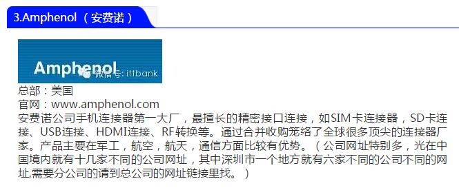 關(guān)于安費(fèi)諾,手機(jī)連接器第一大廠,最擅長(zhǎng)的精密接口連接,如SIM卡連接器,SD卡連接、USB連接、HDMI連接、RF轉(zhuǎn)換等。通過(guò)合并收購(gòu)籠絡(luò)了全球很多頂尖的連接器廠家。產(chǎn)品主要在工防,航空,航天,通信方面比較有優(yōu)勢(shì)。(公司網(wǎng)址特別多,光在中國(guó)境內(nèi)就有十幾家不同的公司網(wǎng)址,其中深圳市一個(gè)地方就有六家不同的公司不同的網(wǎng)址,需要分公司的請(qǐng)到總公司的網(wǎng)址鏈接里找。)