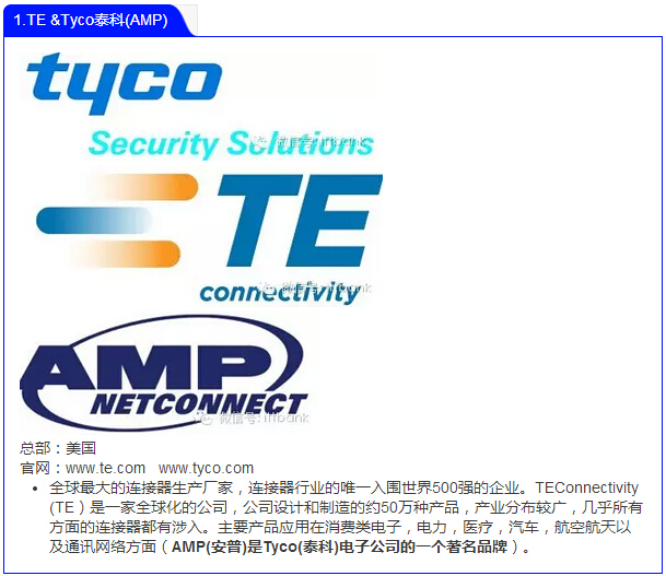 關(guān)于泰科,其總部設(shè)立在美國(guó),被稱為全球最大的連接器生產(chǎn)廠家,也是連接器行業(yè)里唯一個(gè)在世界500強(qiáng)中占據(jù)一席之地的企業(yè)。主要產(chǎn)品應(yīng)用在消費(fèi)類電子,電力,醫(yī)療,汽車,航空航天以及通訊網(wǎng)絡(luò)方面(AMP(安普)是Tyco(泰科)電子公司的一個(gè)著名品牌)。