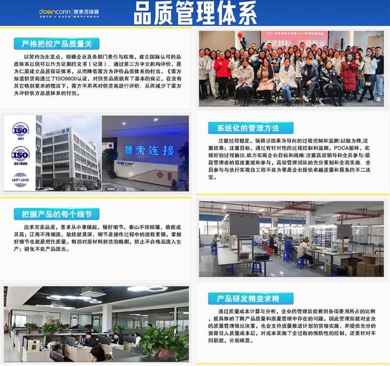 讀完上文之后,您對于“定制連接器模具用什么鋼材比較好”應該非常清楚了,更多“定制連接器模具用什么鋼材比較好”相關(guān)的技術(shù)資料,德索運營團隊會繼續(xù)編輯整理發(fā)布在資訊頻道與您分享。?東莞市德索精密工業(yè)有限公司是一家專業(yè)精密連接器模具生產(chǎn)制造企業(yè),專業(yè)性強,長期為國內(nèi)外知名企業(yè)服務(wù),深受海內(nèi)外客戶的高度信賴!擁有占地 20000 平方的自有工廠,配備了 30 條現(xiàn)代化生產(chǎn)線以及大量的射出成型機、精密沖床、端子壓鑄機、注塑機等先進設(shè)備,具備強大的開模定制能力,可根據(jù)客戶要求對連接器的尺寸、樣式、材料性能、線材長度等進行修改,產(chǎn)品通過了多項質(zhì)量管理體系認證和環(huán)境管理體認證,質(zhì)量有保障。