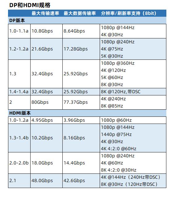 經(jīng)過(guò)時(shí)間的累計(jì)和發(fā)展,DP和HDMI接口沒(méi)有任何改變,但協(xié)議卻在不斷的演化,不同協(xié)議版本的接口傳輸能力的差異是巨大的。