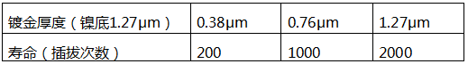鍍層厚度直接影響連接器的壽命,行業(yè)內(nèi)有開展相關(guān)的插拔試驗(yàn),論證鍍層厚度和壽命關(guān)系。某試驗(yàn)數(shù)據(jù)采用的是直徑為0.635 cm的端子,摩擦距離1.27 cm,正向力100g每個(gè)循環(huán)。