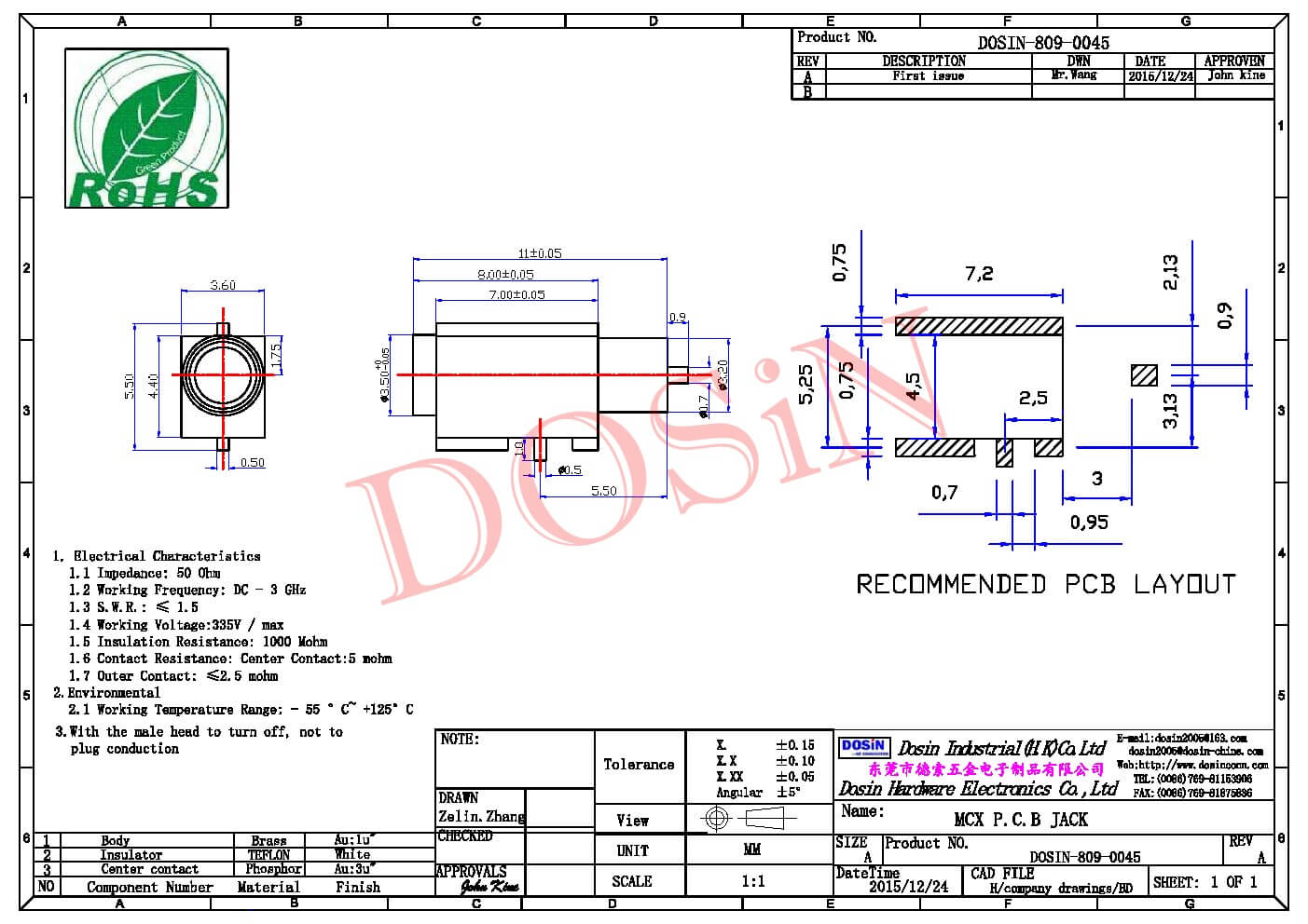 標簽:mcx連接器,pcb板,母頭,50歐,彎插