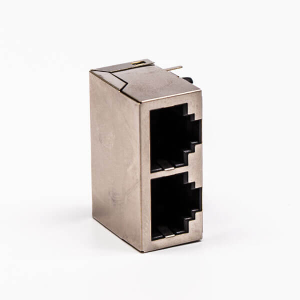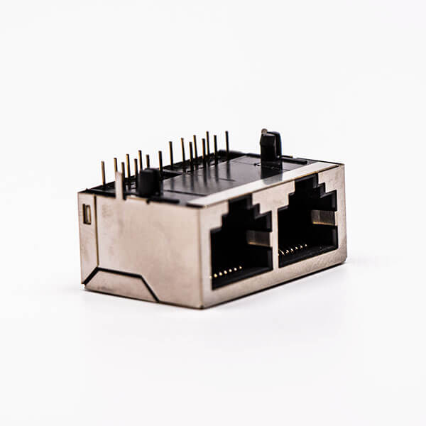 料號:DOSIN-819-0529 標簽:RJ45,母座,PCB板,8P,雙口,彎式,帶屏蔽,不帶燈,不帶彈片,銅殼