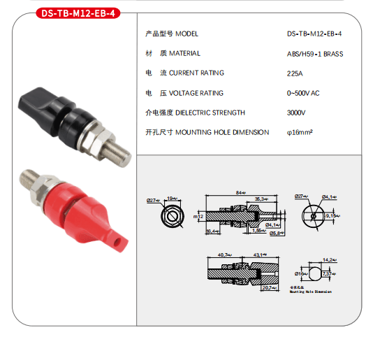 英文描述:Binding Post Terminal Connectors,225A,Outer Screw(M12), Red