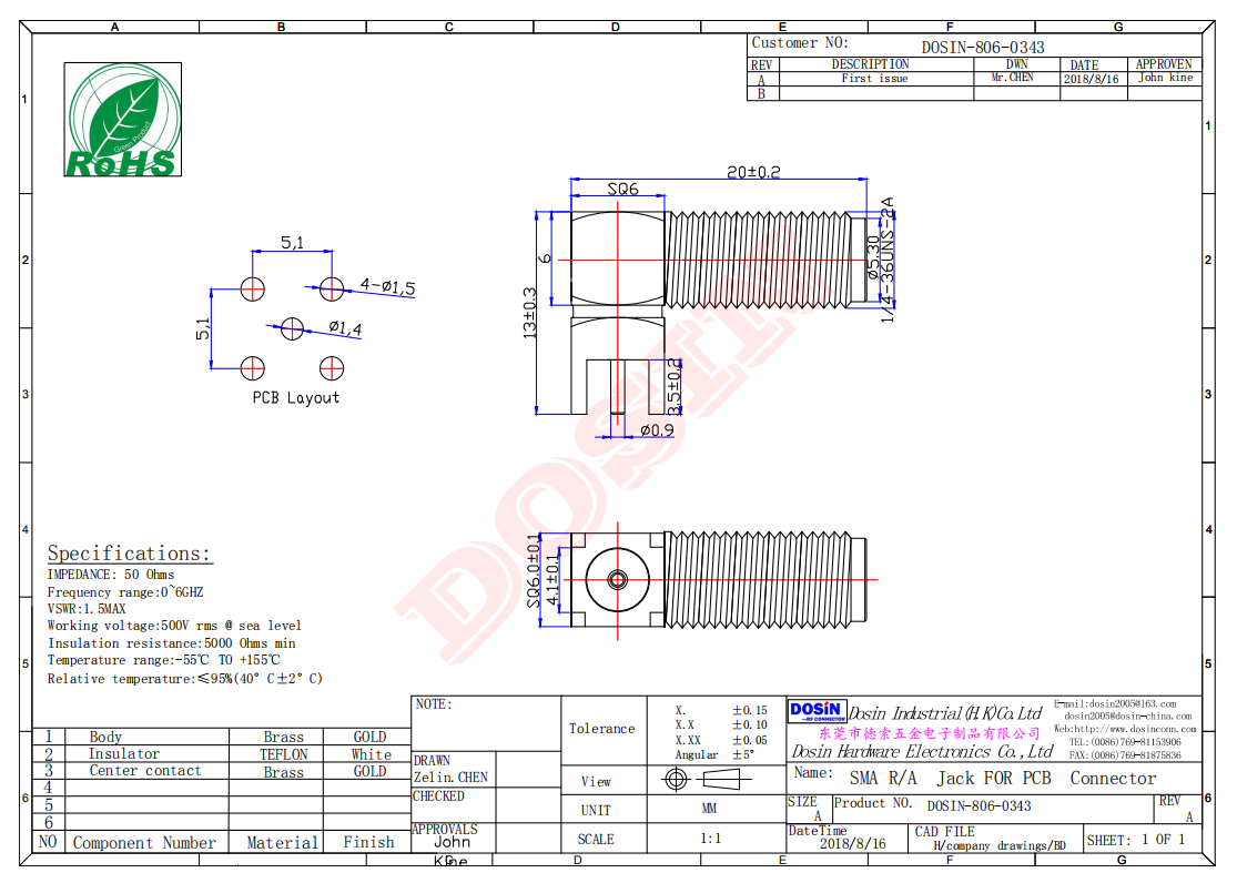 標簽:SMA連接器,母,彎式,50ohm,PCB,線端,焊線,鍍金,銅,防水